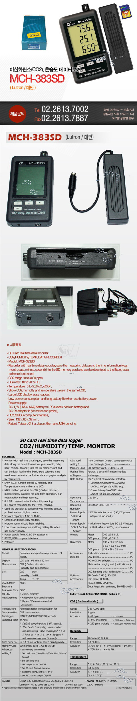 توضیحات و جدول مشخصات دستگاه 3کاره اندازه گیری دما و رطوبت و دی کسیدکربن حرفه ای مدل ام سی اچ-383اس دی ، MCH-383SD لوترون تایوان به زبان انگلیسی طبق کاتالوگ: