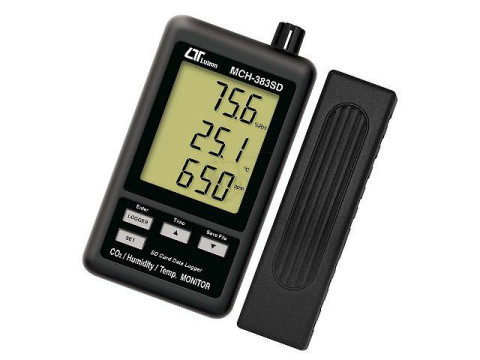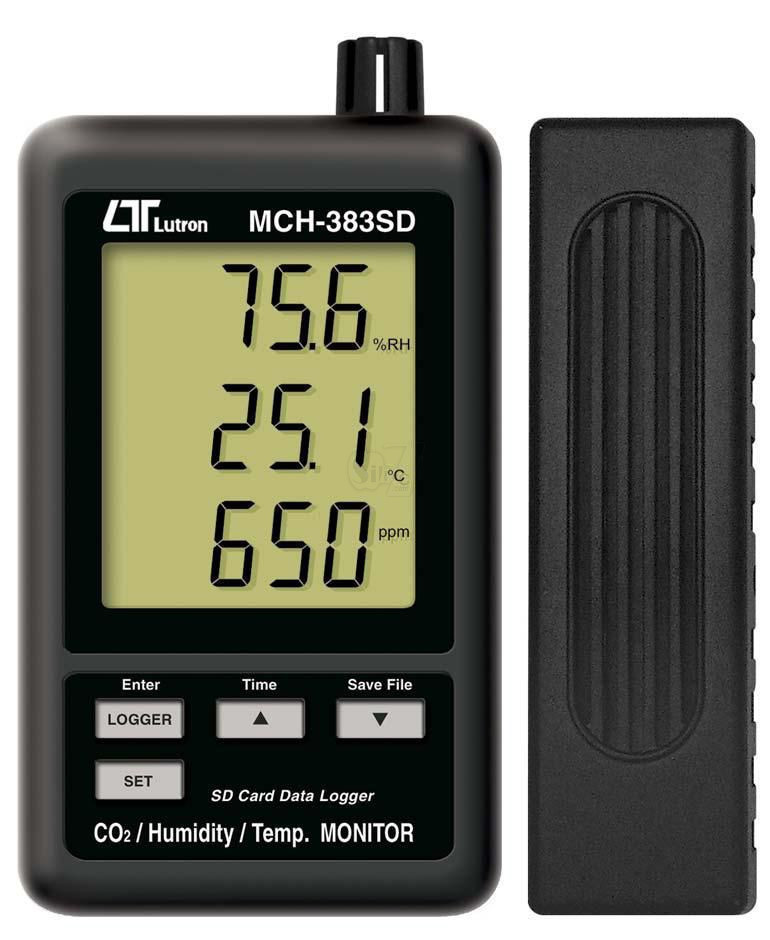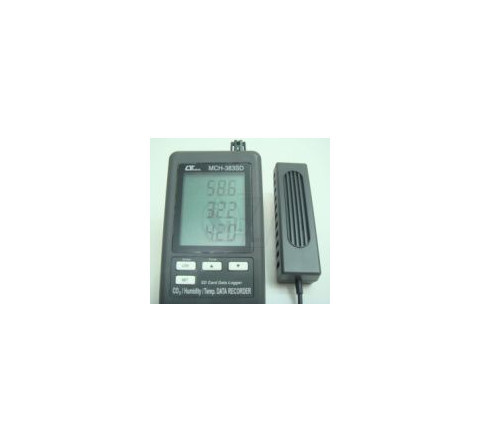 - SD Card real time data recorder CO2/HUMIDITY/TEMP. DATA RECORDER Model : MCH-383SD * Recorder with real time data recorder, save the measuring data along the time information (year,  month, date, minute, second) into the SD memory card and can be download to the Excel, extra  software is no need. * CO2 range : 0 to 4000 ppm. * Humidity : 10 to 90 %RH. * Temperature : 0 to 50.0 oC, oC/oF. * Show CO2, humidity and temperature value in the same LCD. * Large LCD display, easy readout. * Low power consumption and long battery life when use battery power. * DC 1.5V (UM-4, AAA) battery x 6 PCs or DC 9V adapter in. * RS232/USB computer interface. * Size : 132 x 80 x 32 mm. * Patent: Taiwan, China, Japan, Germany, USA pending.