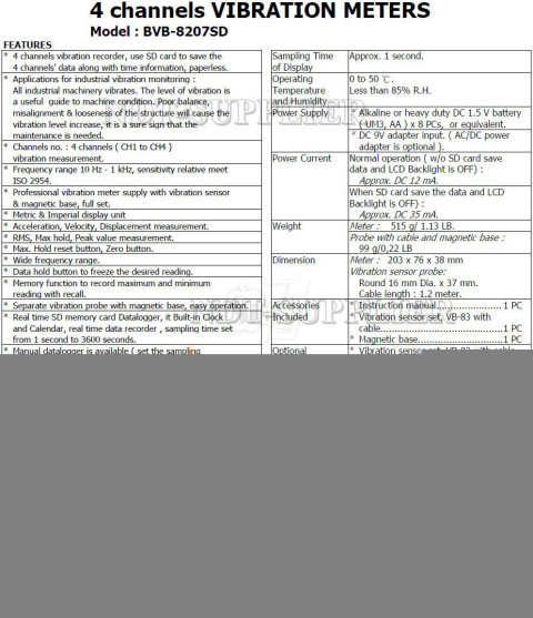 توضیحات و جدول مشخصات پراب و سنسور دستگاه لرزش سنج یا ویبرومتر حرفه ای مدل وی بی-83 ، VB-83 لوترون تایوان به زبان انگلیسی طبق کاتالوگ: