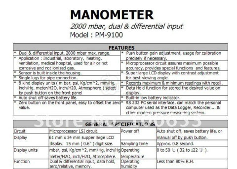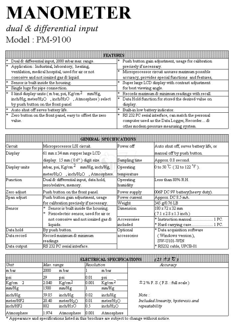 توضیحات و جدول مشخصات مانومتر دیجیتال حرفه ای مدل پی ام 9100 لوترون تایوان به زبان انگلیسی طبق کاتالوگ: