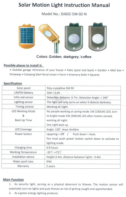 در مدلهای 5 و 9 واتی چراغ در حالت معمولی از 20 الی 50 درصد انرژی ذخیره شده استفاده می کند و نوری ملایم می تاباند ولی زمانیکه سنسور وجود حرکتی را در محدوده دید خود حس کرد نور لامپها با دستور PIR Sensor یا حسگر افزایش پیدا کرده و با 100 درصد قدرت خود نور میتابانند و پس از زمان کوتاهی که شخص از محدوده سنسور رد شد برای صرفه جویی در مصرف انرژی چراغ بصورت دیمری دوباره به حالت نور ملایم بر میگردد.