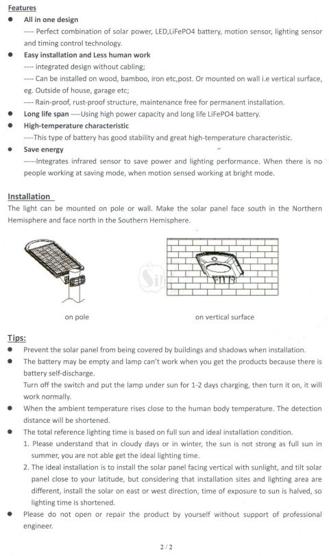 2-جهت بهترین و بیشترین شارژ توصیه میشود این چراغ را در جایی که بیشترین سهم را از تابش نور خورشید دارد نصب کنید و از نصب آن زیر سایه یا زیر موانع و درخت خودداری کنید.