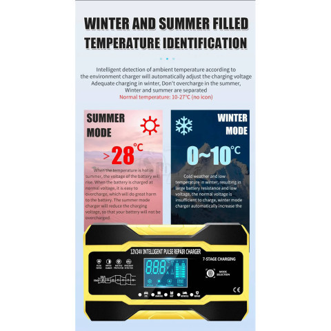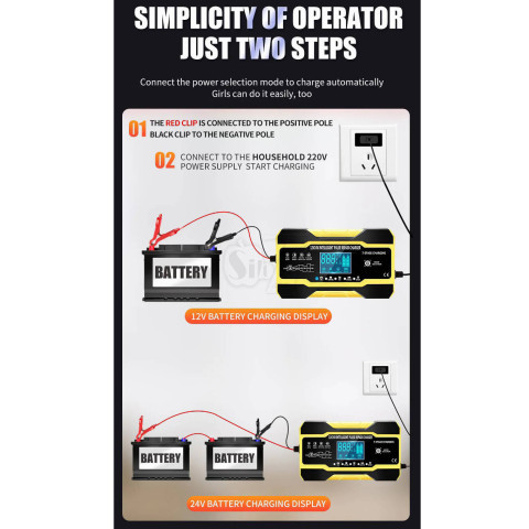 این دستگاه بصورت اتوماتیک ولتاژ باطری متصل را تشخیص داده و ولتاژ خروجی را تغییر میدهد، مثلا اگر صفحه نمایش شارژر 12 ولت را نمایش میدهد با وصل انبرک ها به باطری 24 ولت ولتاژ شارژ خروجی بطور خودکار تغییر یافته و شروع به شارژ با ولتاژ مخصوص باطریهای 24 ولت خواهد نمود.