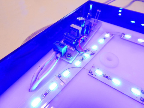 سیم برق را از سوراخ نزدیک ترمینال برق این دستگاه (باکس آبی رنگ ابتدای مدار) عبور داده و آنرا به ترمینال وصل کنید ، دقت کنید که هر دو سیم ها در محل ارتباط با ترمینال تا جایی که میتوانند از هم دور باشند تا احتمال اتصالی از بین برود.