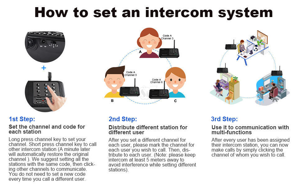 2-همه دستگاهها را در یک کانال مشترک قرار دهید (کنار آنتن یک دکمه 3 حالتهA و B و Cقرار دارد، همه دستگاههایی که میخواهید در یک مجموعه باشند بطور مثال روی کانال A قرار دهید و اگر نویز محیطی زیادی روی این کانال داشتید آنرا تغییر دهید).