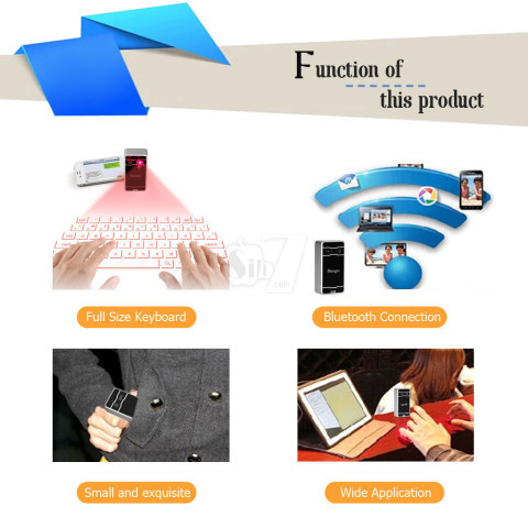 خصوصیات و مشخصات صفحه کلید پروژکتوری لیزری یا کیبرد مجازی نوری بیسیم با قابلیت اتصال به انواع لوازم الکترونیکی بوسیله بلوتوث :