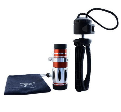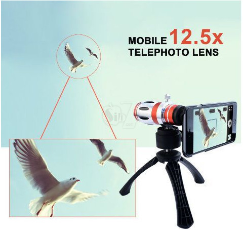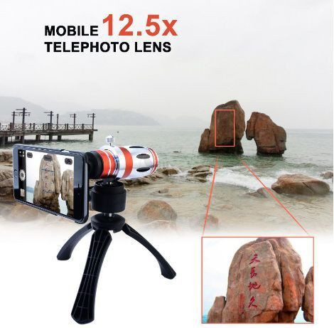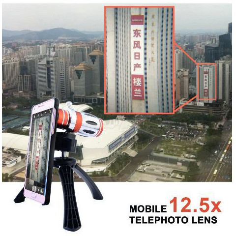 تله لنز جانبی و دوربین بدنه آلومینیومی جدید با بزرگنمائی 12.5 برابر به همراه 3 پایه با قابلیت اتصال به انواع گوشی های موبایل دوربین دار برای تبدیل آنها به یک دوربین قوی و تقویت شده برای مشاهده و عکسبرداری و فیلمبرداری از سوژه ها و افراد و اجسام دوردست با بزرگنمائی 12.5 برابر.