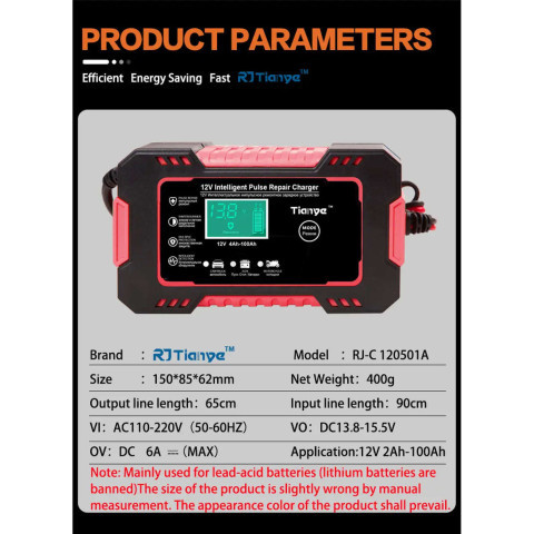 RJTiyanye highly rated 12V 6A intelligent pulse repair charger is a must have for any 12V Lead Acid battery with a rated capacity between 4Ah and 100Ah in cars, motorbikes, boats, agriculture vehicles and small trucks.