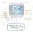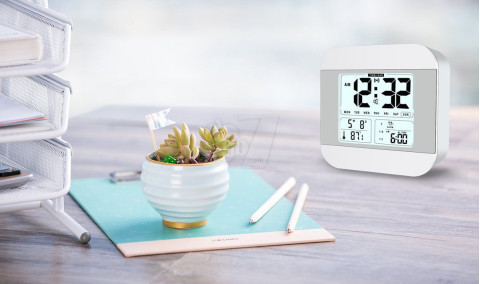 Additional on-screen information includes month, date, alarm setting, and indoor temperature.