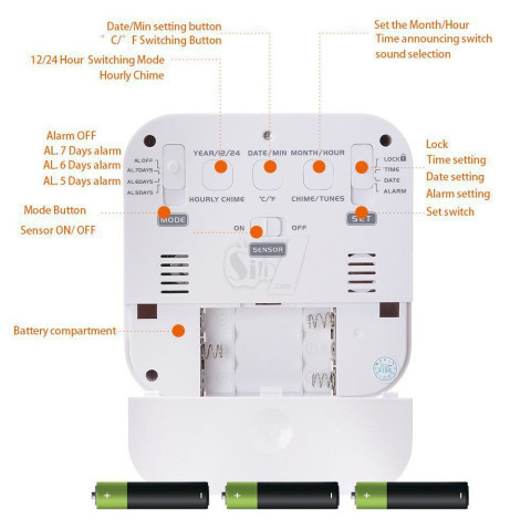 3 Groups of alarm can be set, and you can choose set "AL. 7days", "AL.6 DAYS" or "AL.5 DAYS", and there are 7 different sound for choosing. Such as BIBI, CUCKOO etc.