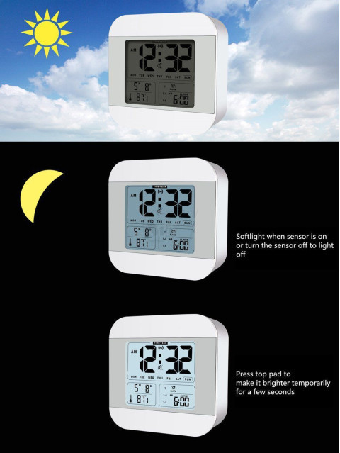 SENSOR SOFT LIGHT-Turn the sensor on and clock is automatically lightened up in dark so the digits are easy to read but it’s not bright that it will affect your sleep.