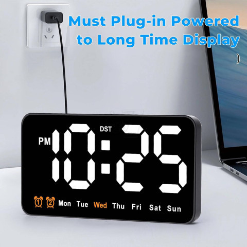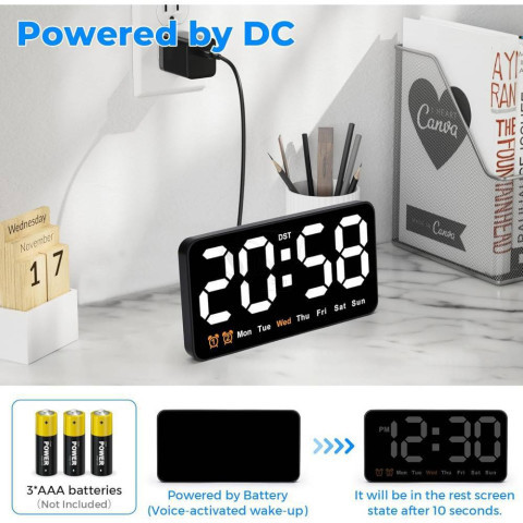 When connected to a power source, it can be conveniently used as a plug-in clock. Alternatively, you can use battery power for easy placement. In battery-powered mode, the clock runs in voice-activated mode, and the clock lights up for 10 seconds and then automatically goes off the screen.