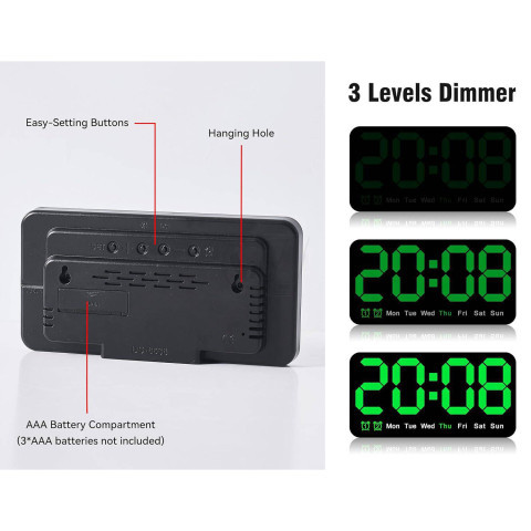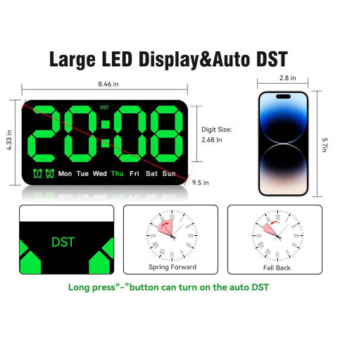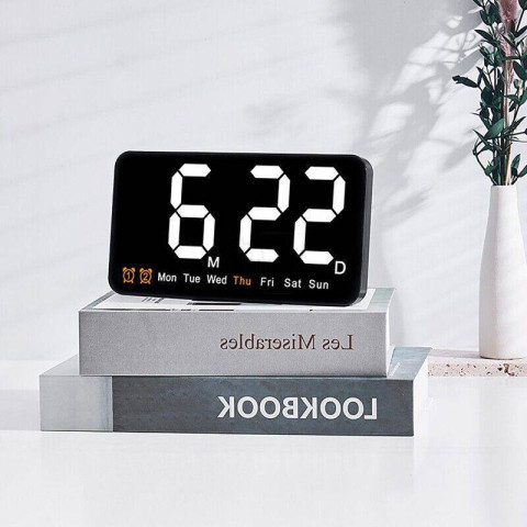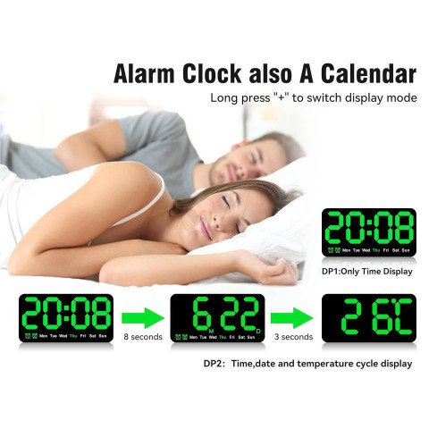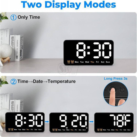 This Digital Alarm Clock is equipped with a large 9.05-inch high-definition LED screen, ensuring a clear and comfortable viewing experience. Large font display, support calendar function, with month, date, day of week and temperature.