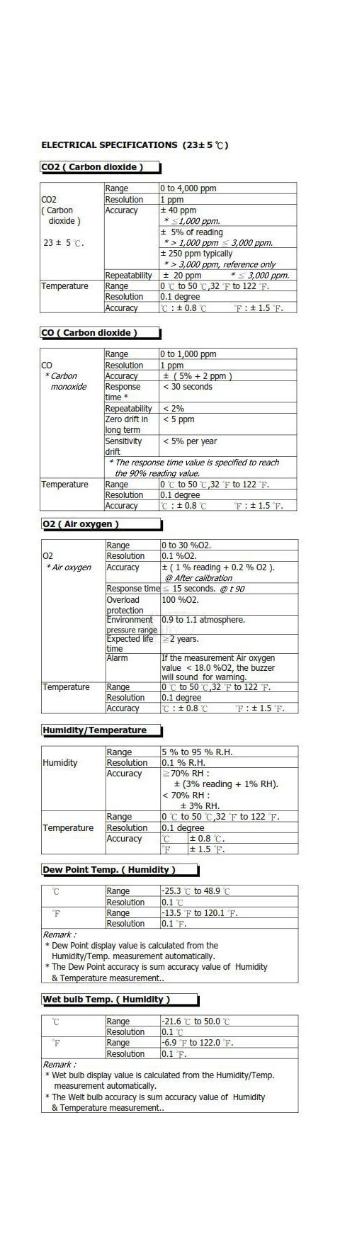* Dew point Temp. and Wet bulb Temp. measurement. ELECTRICAL SPECIFICATIONS ( 23± 5  )