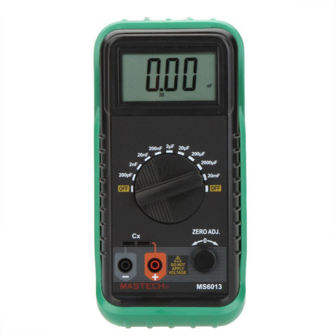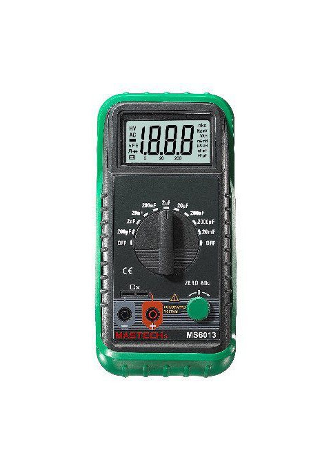 MASTECH MS-6013 Digital Capacitance Meter Capacitor Tester Measuring 200pF~20mFThe digital capacitance meter gives a direct reading of capacitance on a 3 1/2 digits LCD display. Nine ranges give precision readings from 0.1pF to 20mF, which included virtually all capacitors used in electronic engineering laboratory, production, service shops and schools. Its battery operation, light weight and small size make it a truly portable instrument.