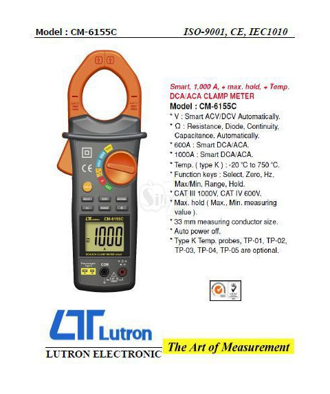 Lutron CM-6155C DCA/ACA CLAMP METER, Smart, 1,000 A   Features DCA/ACA CLAMP METER Model: CM-6155C V: Smart ACV/DCV Automatically....