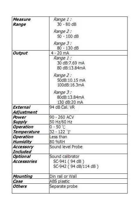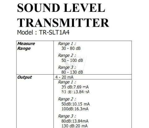 SOUND TRANSMITTER Model : LUTRON TR-SLT1A4 * Range : 30 to 130 dB, 3 ranges. * Output : 4 to 20 mA, DC. * Power : 90-260 ACV.