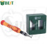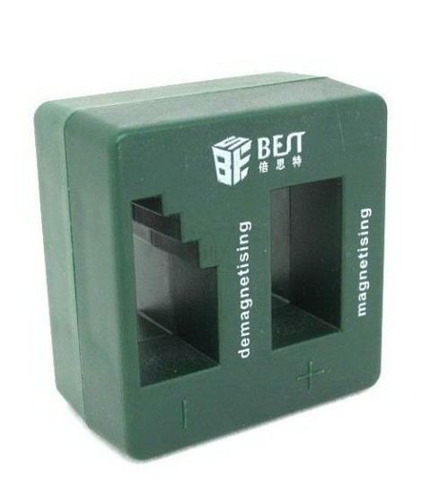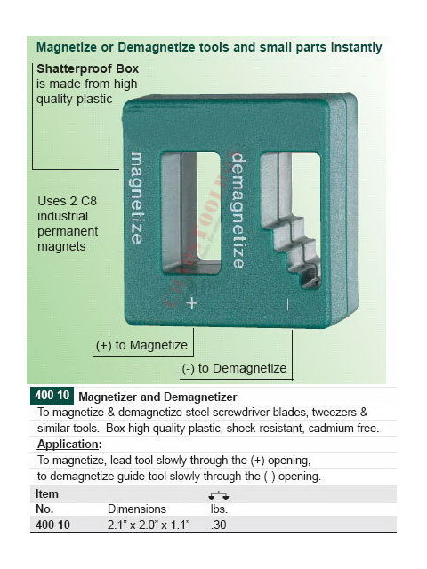 Features : Great magnetizing and demagnetizing tool for screwdrivers; Easy to use; Just insert the screwdriver into the "+" slot for a while, then it can pick up the nuts easily; Put it into the "-" slot, it will be demagnetized quickly