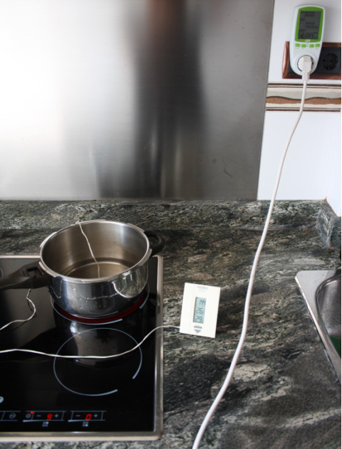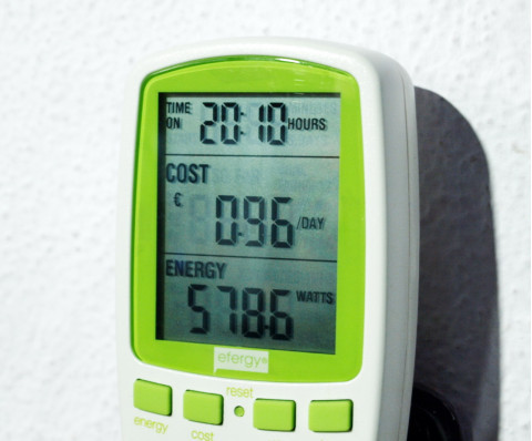 A large LCD display counts consumption by the Kilowatt-hour, just like utility companies.