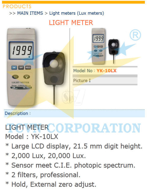 LIGHT METER Model : YK-10LX * Large LCD display, 21.5 mm digit height. * 2, 000 Lux, 20, 000 Lux. * Sensor meet C.I.E. Photopic spectrum. * 2 filters,...