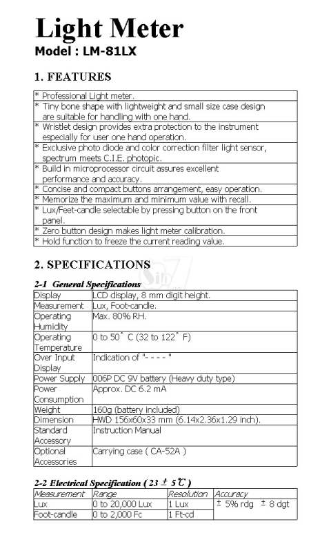 * 2, 000 Lux, 20, 000 Lux, auto range.