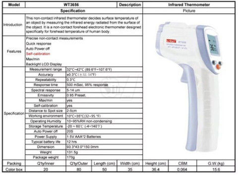 WINTACT WT3656 infrared thermometer determines surface temperature of an object by measuring the infrared energy radiated from object surface.