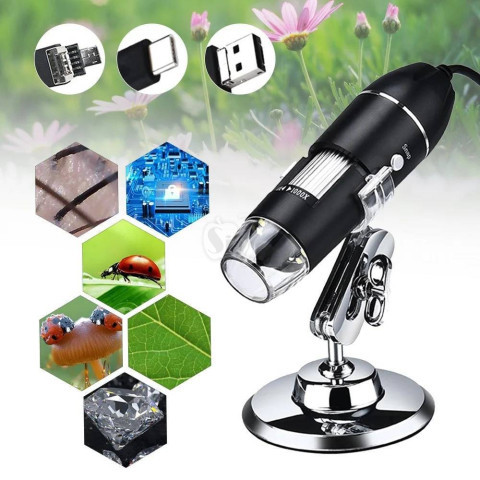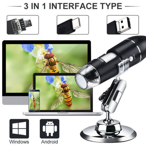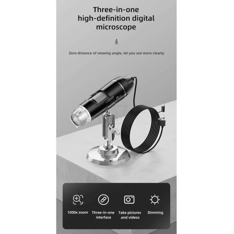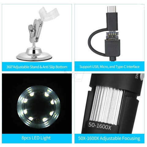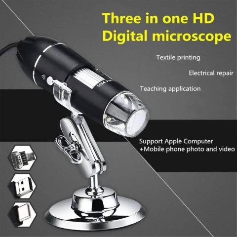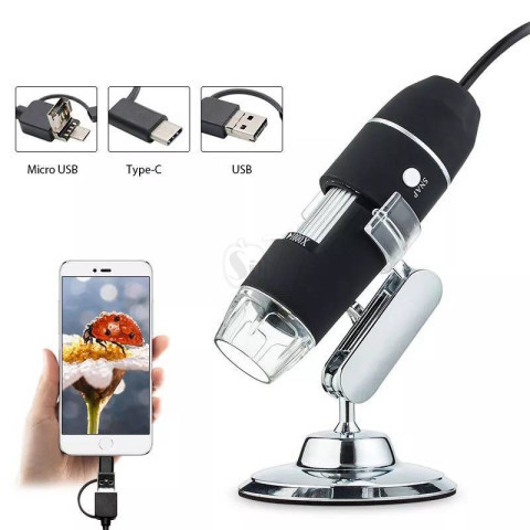 This microscope supports USB connection to computers or your Android mobile phone for real-time images transfer, picture and video capture.