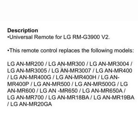 LG Remote Controls: AN-MR300, AN-MR3005, AN-MR3007, AN-MR400G, AN-MR400H, AN-MR400P, AN-MR500G, AN-MR600, AKB74495301, AKB74855401, AN-MR650, AN-MR650A, AN-MR18BA, AN-MR19BA
