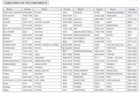 AIDELONG, AITE, AKIRA, AUCMA, AUX, BEIJINGJIGDIAN, BIG-THUMB, BOERKA, BOSHI, CHANGFU, CHANGHONG, CHANGLING, CHIGO, CHUNLAN, CHUANGHUA, CORONA, CONROWA, DAIKIN, DENKI, DONGXIA, DONGXIBAO, ELECTROLUX, FEILU, FEIGE, FRESTECH, FUNAI, FUJITSU, GALANZ, GARRIER, GLEE, GOLDSTAR, GREE, GUQIAO, GUANGDA, HAIER, HISENSE, HITACHI, HICON, HONGYI, HUABAO, HUAGAO, HUALING, HUAMEI, HUIFENG, HUAKE, INYCIN, JDC, JIALE, JIANGNAN, JINBEIJING, JINDA, JINSONG, JOHNSO, KANGLI, KELONG, KT02_D001, KT02_D002, KTY001, KTY002, KTY004, LANGGE, LG, LIANGYU, LITTLESWAN, MCQUAY, MD, MEILING, MINGXIN/BOYIN, MITSUBISHI, NATIONAL, NIKKO, NEC, NISO, PANASONIC/NATIONAL, PANDA, QIXING, RAYBO, RORK, ROWA, SAIJO, SAMSUNG, SANYO, SERENE, SHAMEI, SHANGLING, SHANGXING, SHARP, SHENGFENG, SHINCO, SHUANGLU, SOGO, SOYEA, TCL, TECO, TIANJINKONGTIAO, TIANYUAN, TOBO, TOSHIBA, TONGLI, TRANE, UTTLEDUCK, UNI-AIR, WANBAO, WEILI, WEITELI, WHIRLPOOL, XILENG, XINGHE, YAIR, YORK, YUTU...