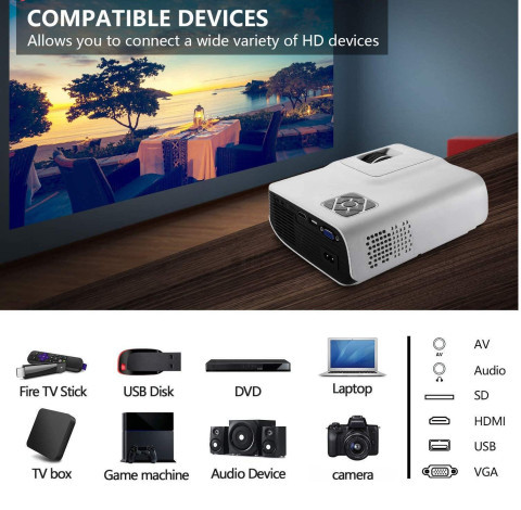 The HD 720p Projector delivers extraordinarily sharp video quality images, perfect for movies, gaming and watching sports, It also supports 1080p Color accurately.