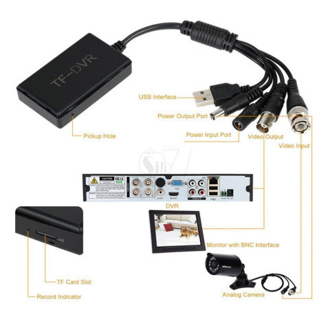 This item is a mini 1ch TF card DVR video recorder, which can be connected to CCTV analog camera to record video and audio on the TF card.